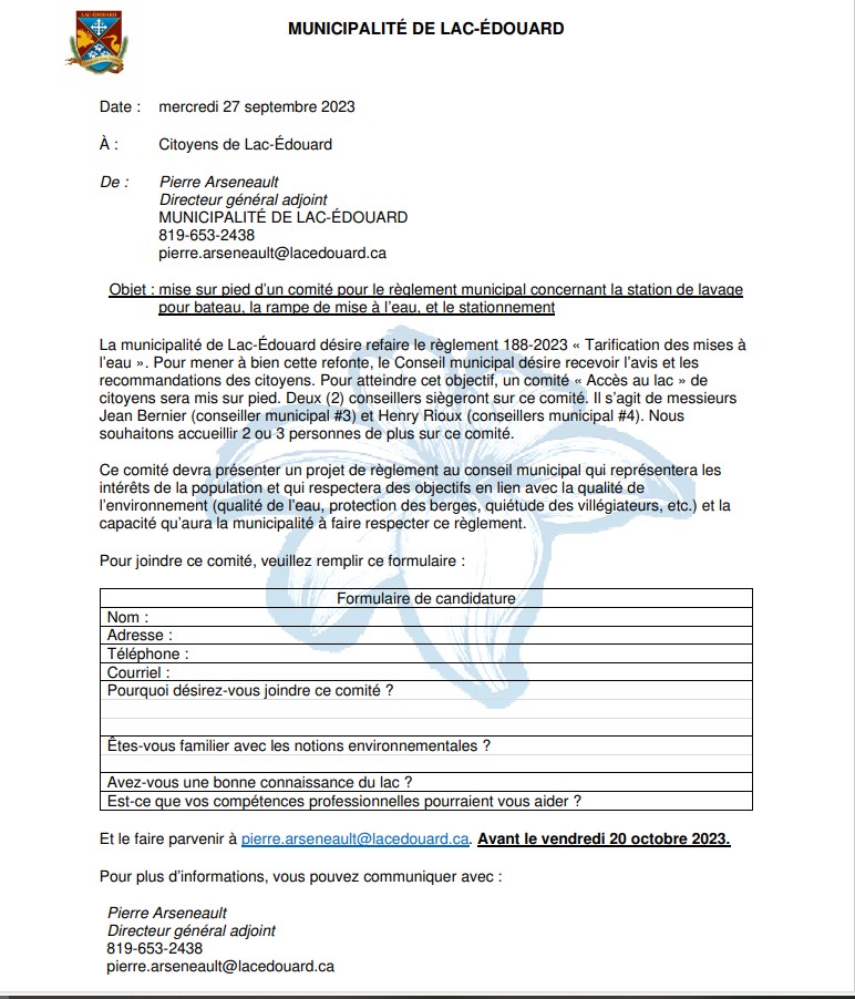 Pour plus de renseignements ou pour joindre ce comité, veuillez imprimer et remplir ce formulaire et le faire parvenir à pierre.arseneault@lacedouard.ca
